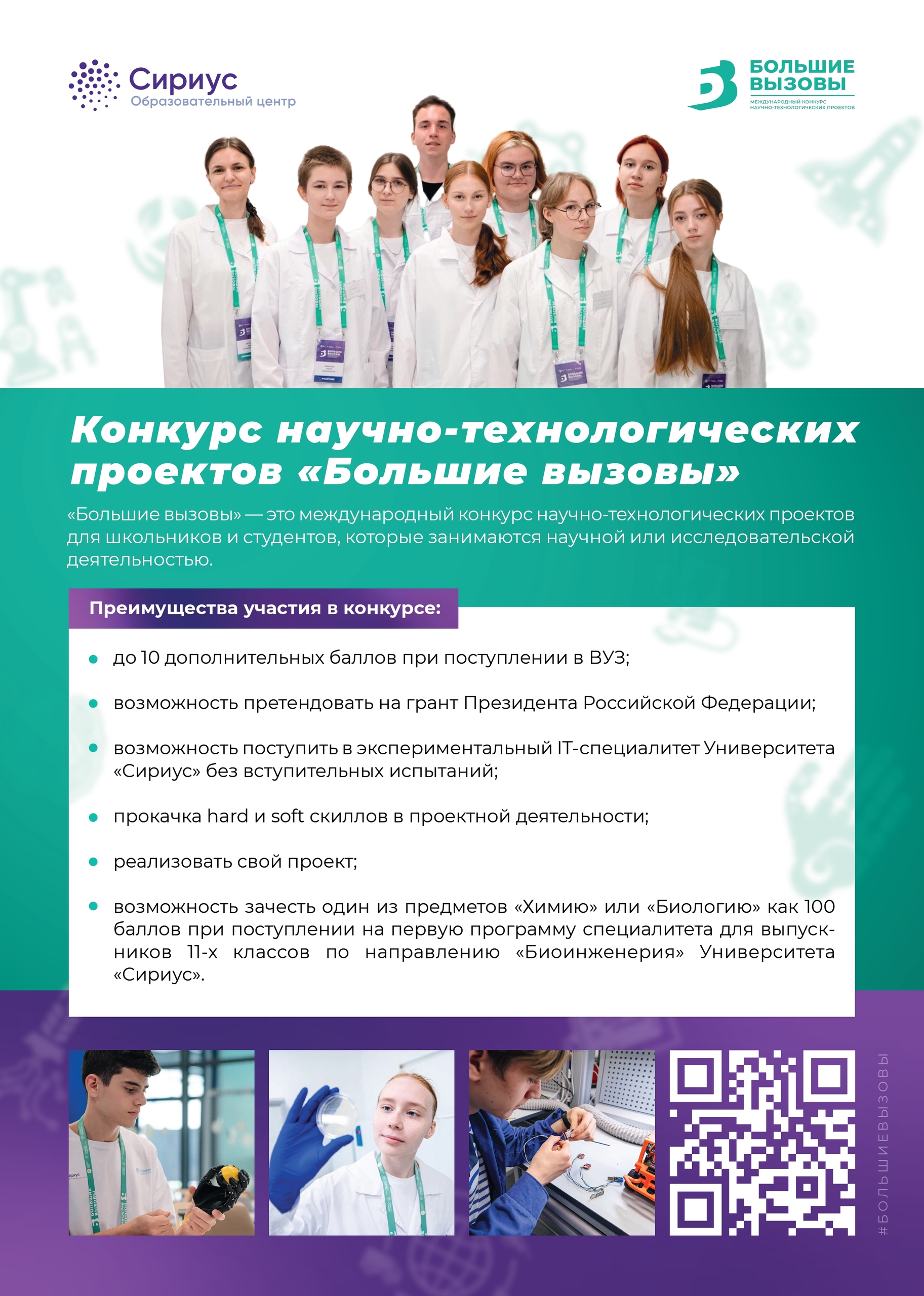 Также это откроет путь на профильные образовательные программы «Сириуса», даст доступ к участию в онлайн‑курсах и мастер‑классах по актуальным научным направлениям., а также возможность презентовать себя и свои идеи на научно‑практических конференциях.