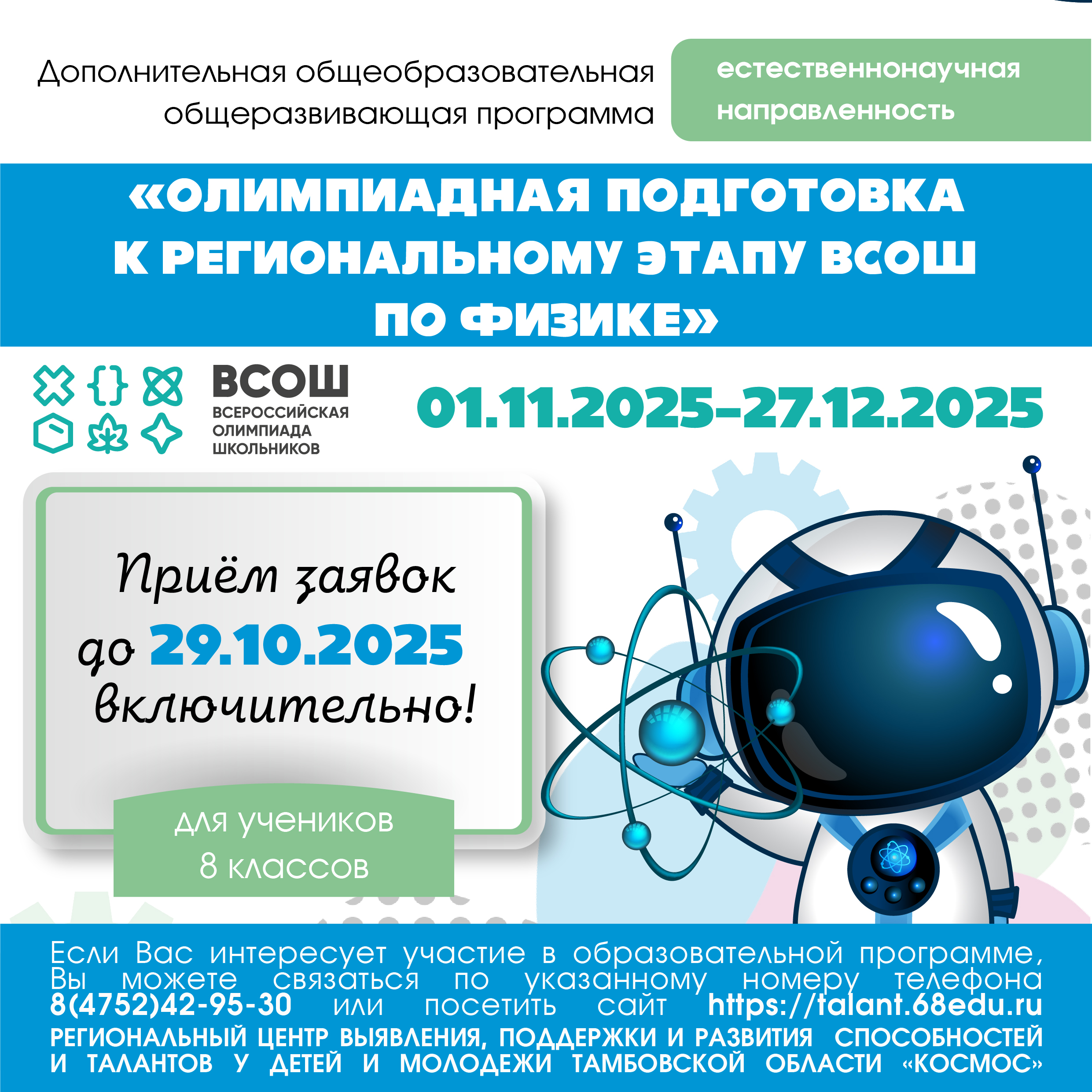 Мы открываем приём заявок на дополнительную общеобразовательную общеразвивающую программу естественнонаучной направленности «Олимпиадная подготовка к региональному этапу ВСОШ по физике» (для обучающихся 8 классов).