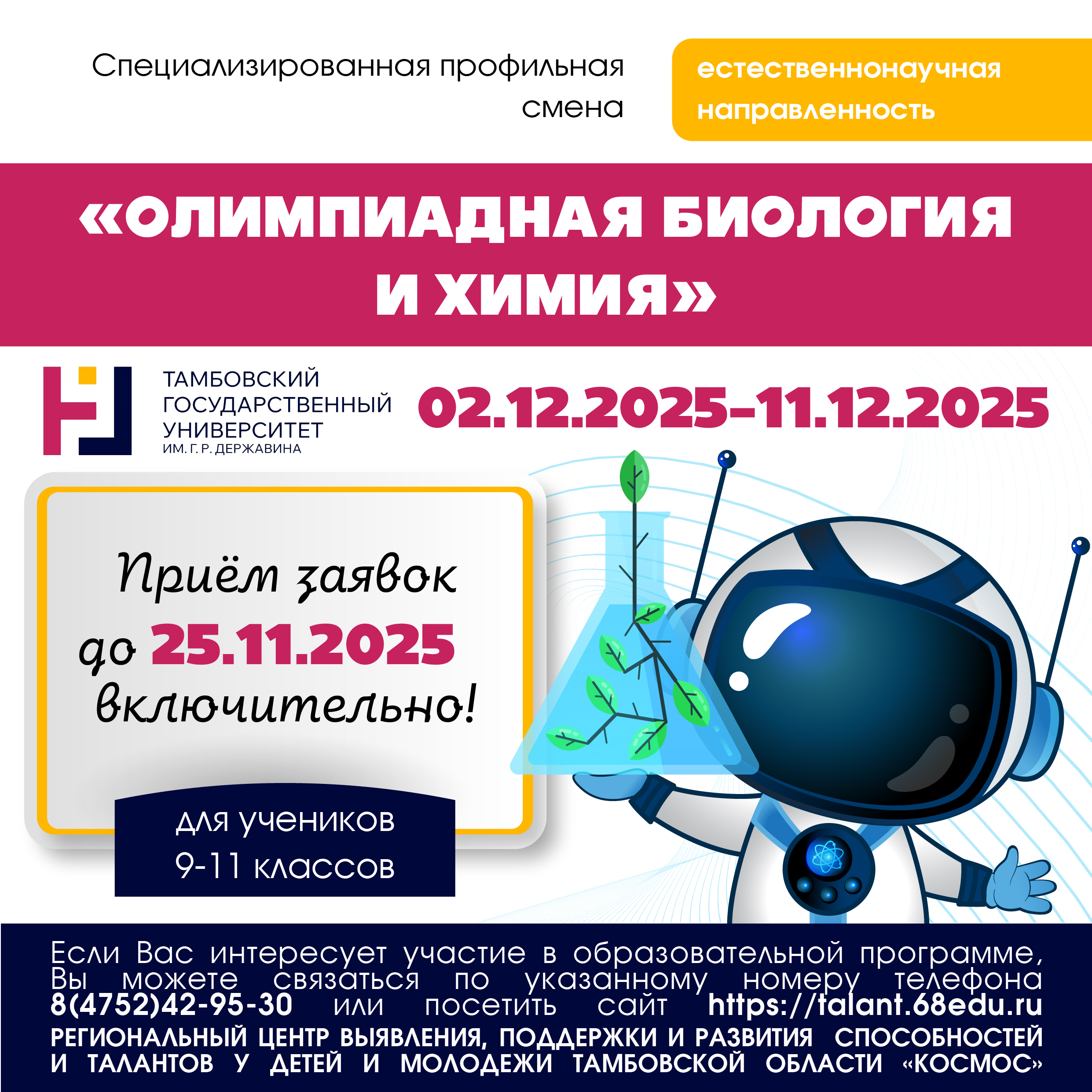 👩🏼‍🔬 ДООП естественнонаучной направленности «Олимпиадная биология и химия». Вы получите важные знания и умения, которые помогут успешно выступить на Всероссийской олимпиаде школьников по химии и биологии, а также откроете новые горизонты своего развития и сможете уверенно решать самые сложные задачи. Вас ждут интересные лекции, эксперименты и мастер-классы, направленные на тренировку решения сложных задач и повышение вашей уверенности в собственных силах.