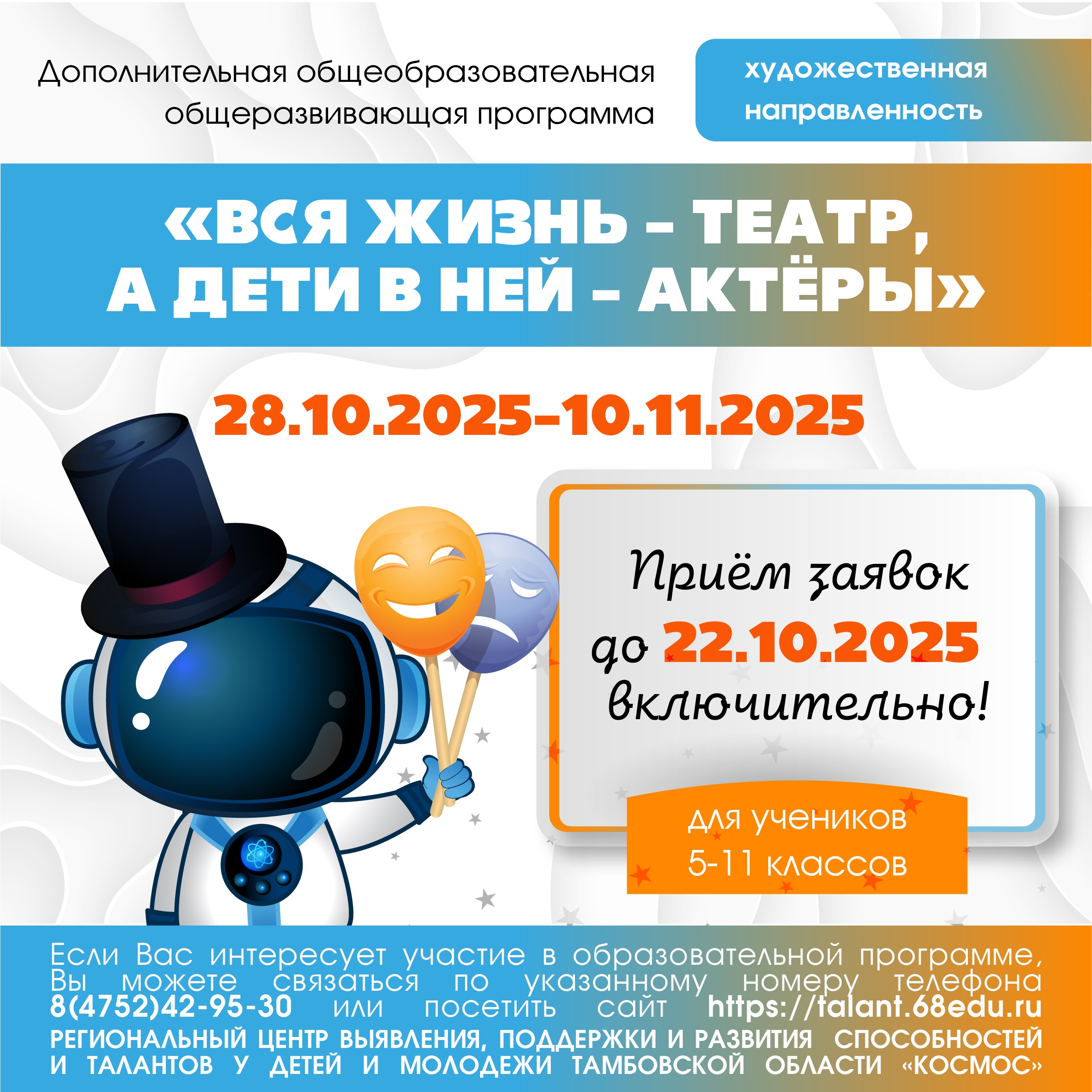 Открыт приём заявок на дополнительную общеобразовательную общеразвивающую программу художественной направленности «Вся жизнь – театр, а дети в ней — актёры».